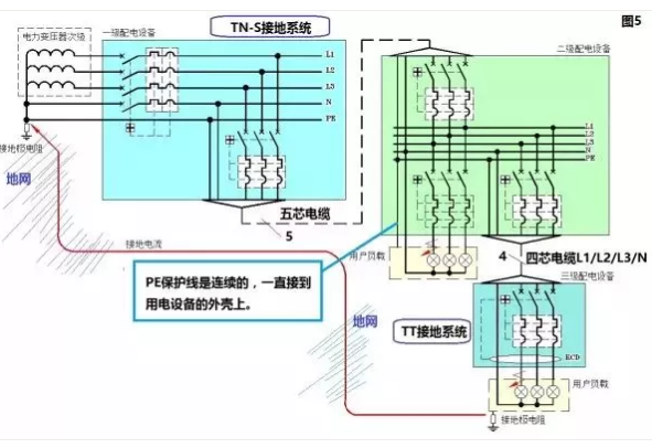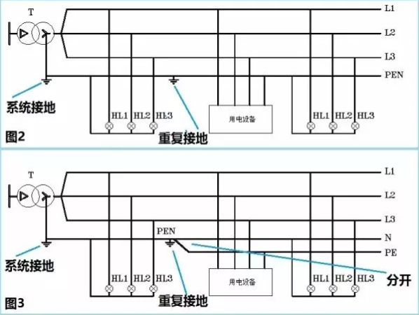 注意哦,圖2對應(yīng)的接地系統(tǒng)叫做TN-C,而圖3對應(yīng)的接地系統(tǒng)叫做TN-C-S。