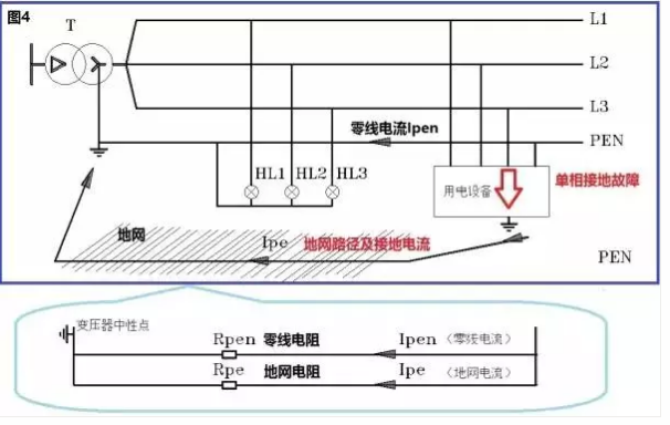 再看圖3,我們發(fā)現(xiàn)保護性中性線PEN中采取多點接地的方法,以避免出現(xiàn)保護性中性線斷裂點后部電壓上升的情況。
