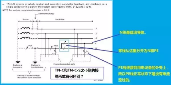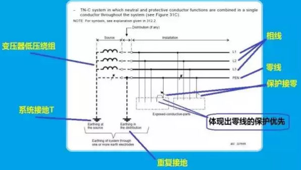 知曉這幾個概念后,我們來看看IEC給出的有關(guān)TN-C和TT系統(tǒng)的原圖。注意,這兩幅圖是不容置疑的,是有關(guān)接地系統(tǒng)的權(quán)威解釋。