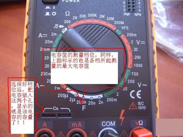 2、將功能旋轉(zhuǎn)開關(guān)打至電容(C)測量檔,并選擇合適的量程。