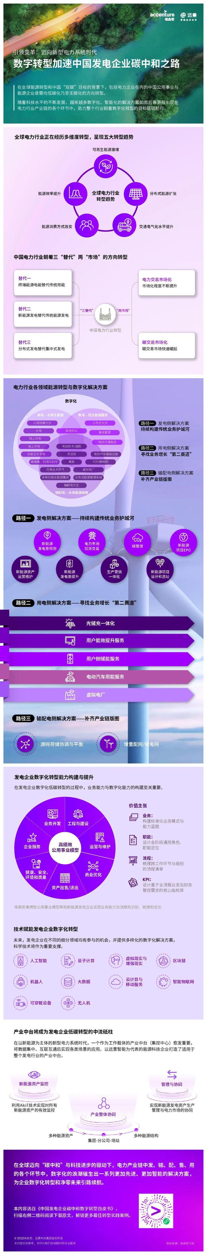 為了應(yīng)對(duì)未來(lái)更加“碎片化”的能源系統(tǒng),滿足消費(fèi)者日益迭代的需求,埃森哲攜手遠(yuǎn)景發(fā)布的《中國(guó)發(fā)電企業(yè)碳中和數(shù)字轉(zhuǎn)型白皮書(shū)》勾勒了發(fā)電企業(yè)圍繞發(fā)電、輸配電和用電全產(chǎn)業(yè)鏈構(gòu)建轉(zhuǎn)型路徑,并探討各類數(shù)智化解決方案的應(yīng)用場(chǎng)景。