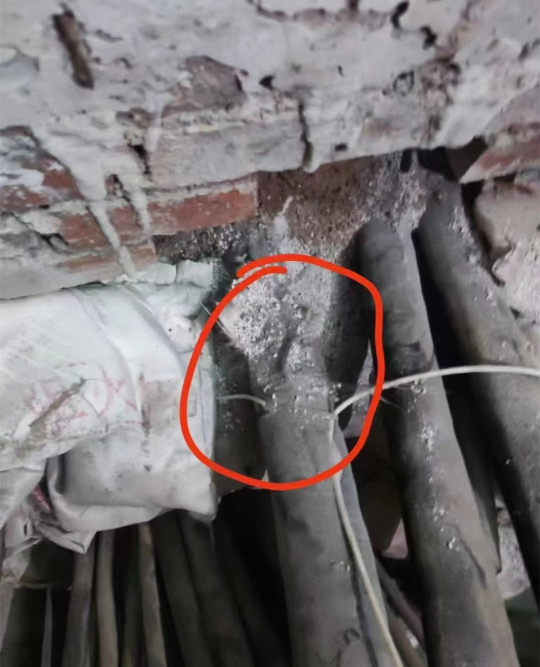 經(jīng)過查找確認(rèn)在故障點兩?左右附近聽?微弱放電聲?,??在這附近開挖,挖開后發(fā)現(xiàn)有電纜破損修復(fù)的痕跡。