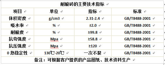我公司耐酸磚是以石英、長(zhǎng)石、粘土為主要原料,經(jīng)高溫氧化分解制成的耐腐蝕材料,產(chǎn)品背部加燕尾槽,施工時(shí)便于與耐酸泥牢固粘接,不易脫落。即可保證工程質(zhì)量,又能延長(zhǎng)工程使用壽命。